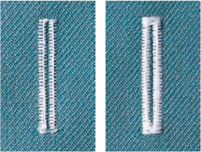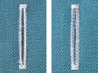 Mũi may tam giác ←→ Mũi may zigzag (Để chuyển đổi giữa đường may hình tam giác và đường may zigzag, cần phải thay đổi cách xỏ chỉ của ổ chao và độ căng của chỉ suốt..)